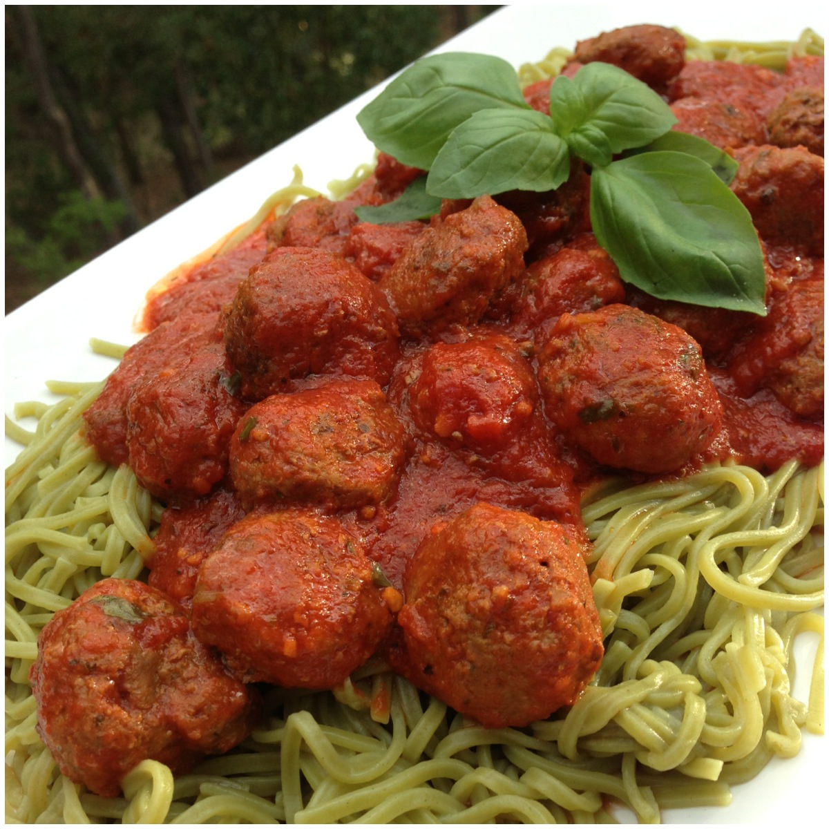 Spinach wholemeal pasta with basil meatballs bolognese |