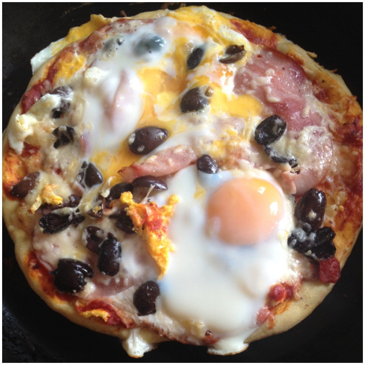 This was a mixture of Hawaiian and Australian (with egg) pizza, then I sprinkled a little bit of Europe AKA kalamata olives :-)