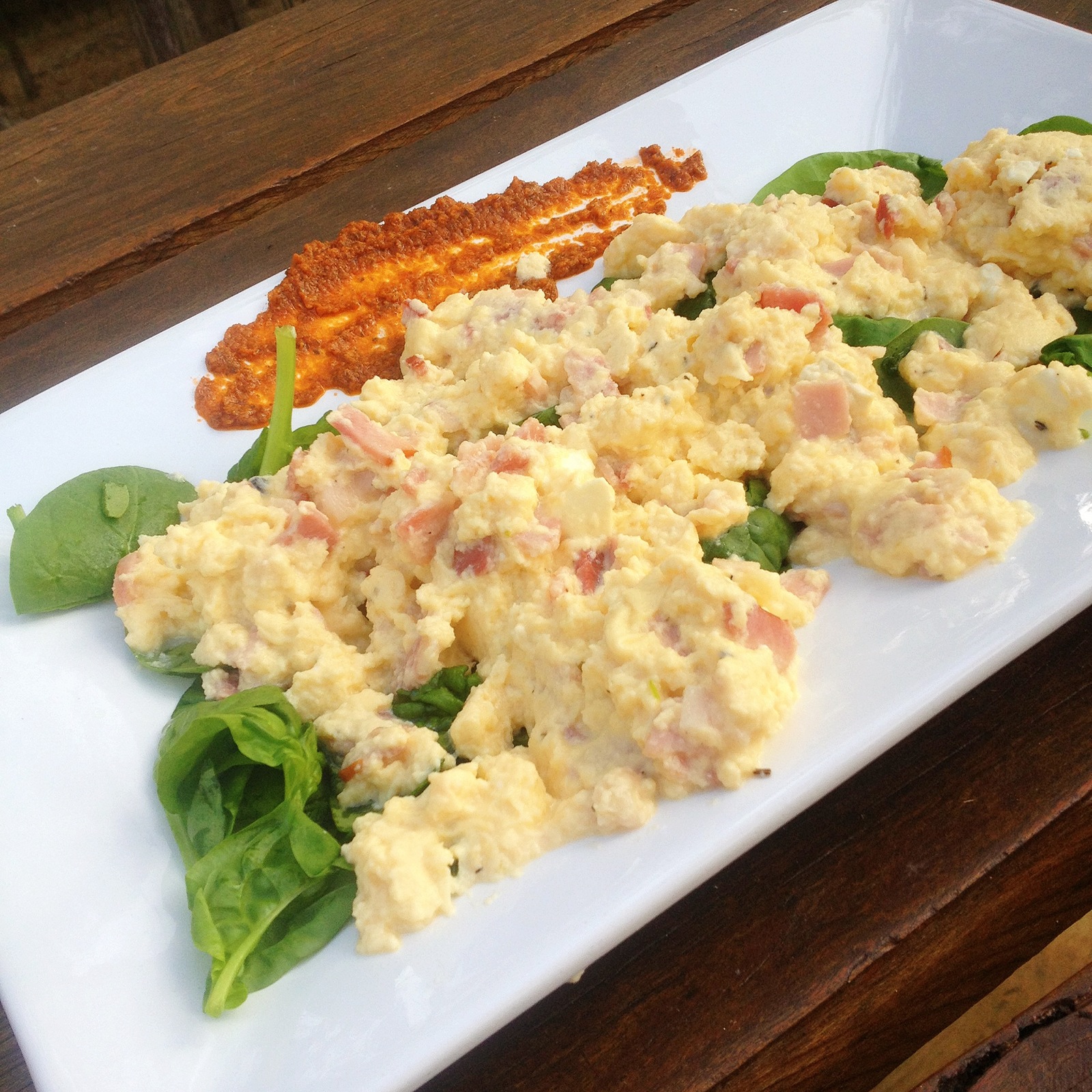 Cook bacon with garlic until golden. In the meantime whisk eggs, add milk, feta in a bowl and pour into frypan on a gentle heat. Swirl and stir until cooked to your liking. We served ours on a bed of spinach and sundried tomato pesto. Real quick, kids had a second serve.