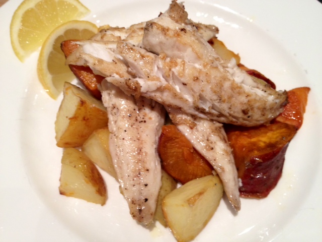 BBQ flat head fish with roasted sweet and potato vegetables (sorry this presentation looks hideous!) it sure tasted better than it looks...