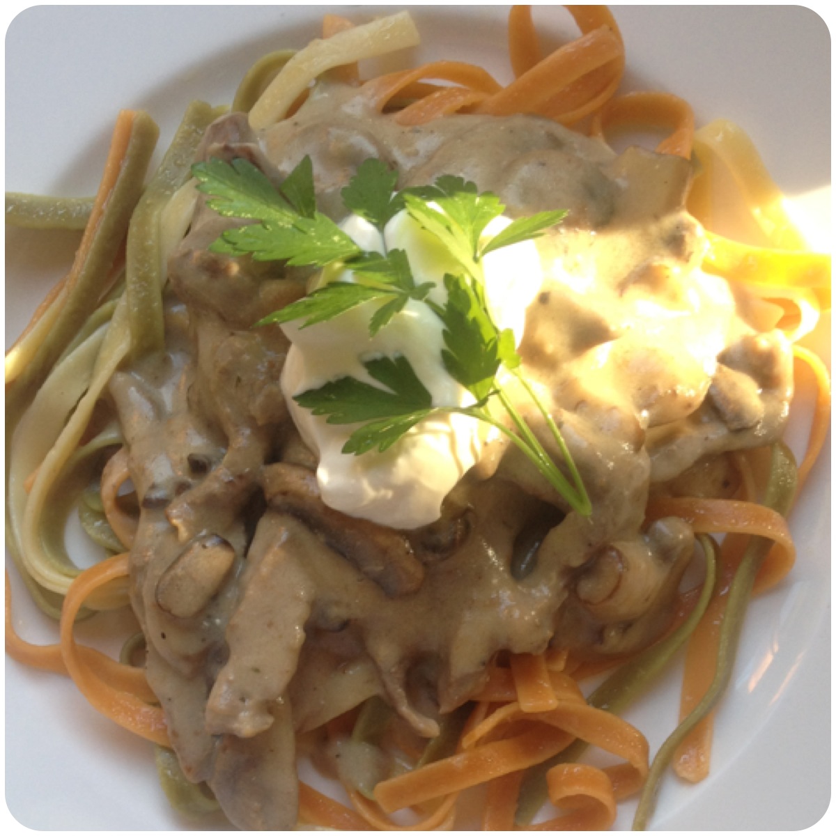 Dinner Creamy beef stroganoff with tri colour fettuccini pasta