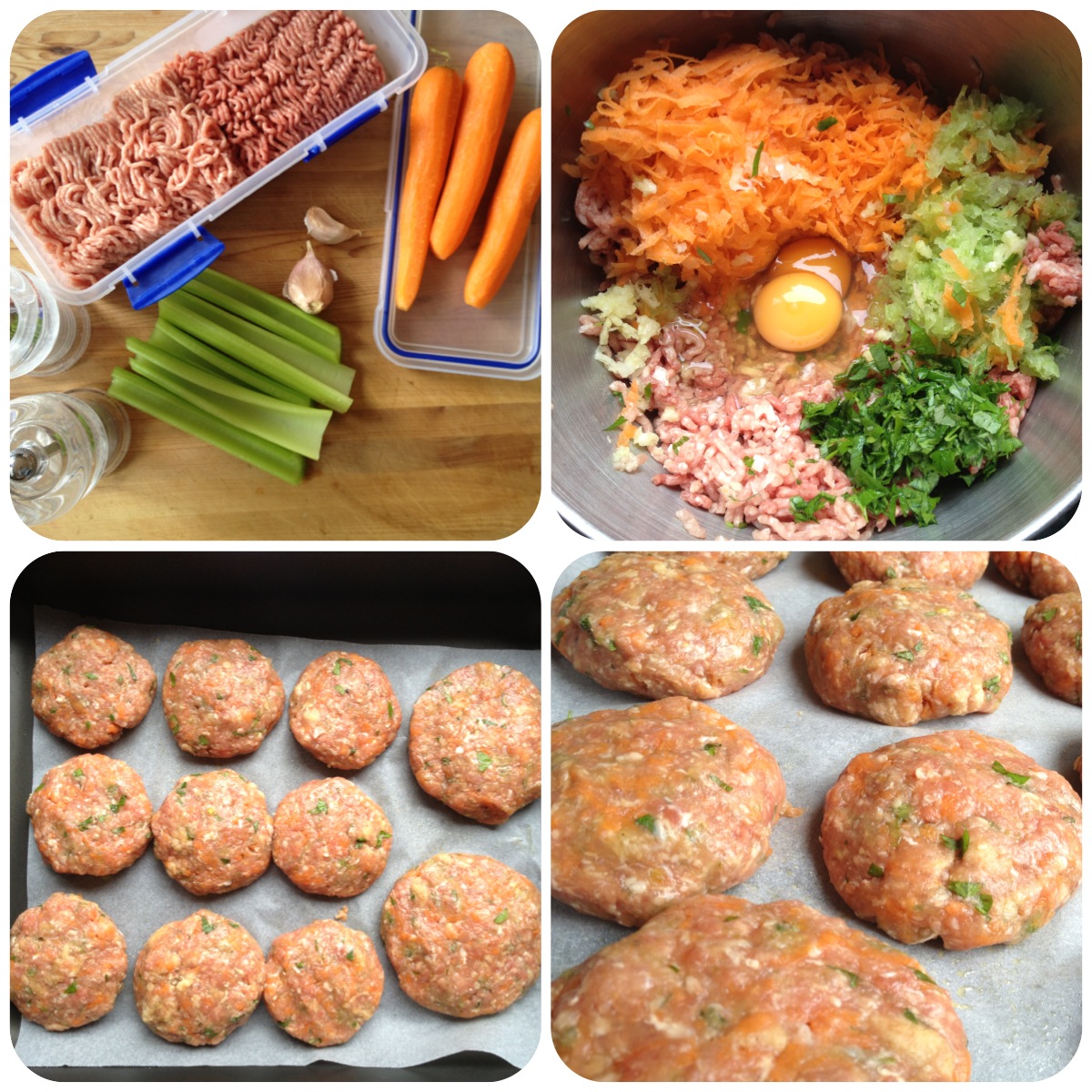 Ingredients 500gms of both beef and pork mince 1 clove of garlic minced (I usually add an onion but I was out!) grated carrots & celery (or whatever vegetables I have in the fridge) a handful of fresh parsley and oregano herbs chopped wholemeal bread soaked in milk sprinkle of curry powder 2 eggs S&P