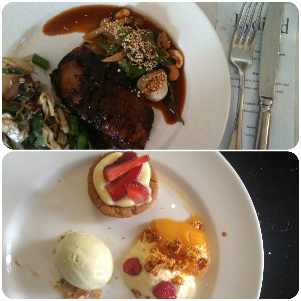 Lunch Chinese roasted duck (my fave!!!) pickled ginger & lynche salad Clear duck broth with tapioca & Thai basil (to die for!) Thai vegetable & herb salad Steamed jasmine rice