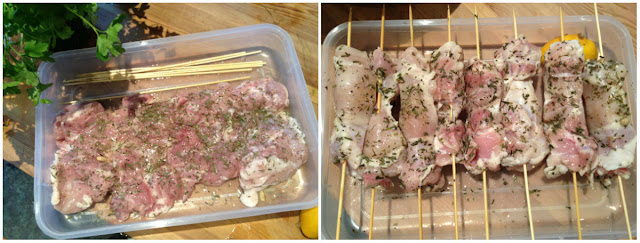 With the chicken skewers I pretty much marinated them in lemon juice, seasoned with S&P, 2 crushed garlics and tarragon leaves. I also leave the bamboo skewers in the tub to soak up the lemon juice to avoid them burning!