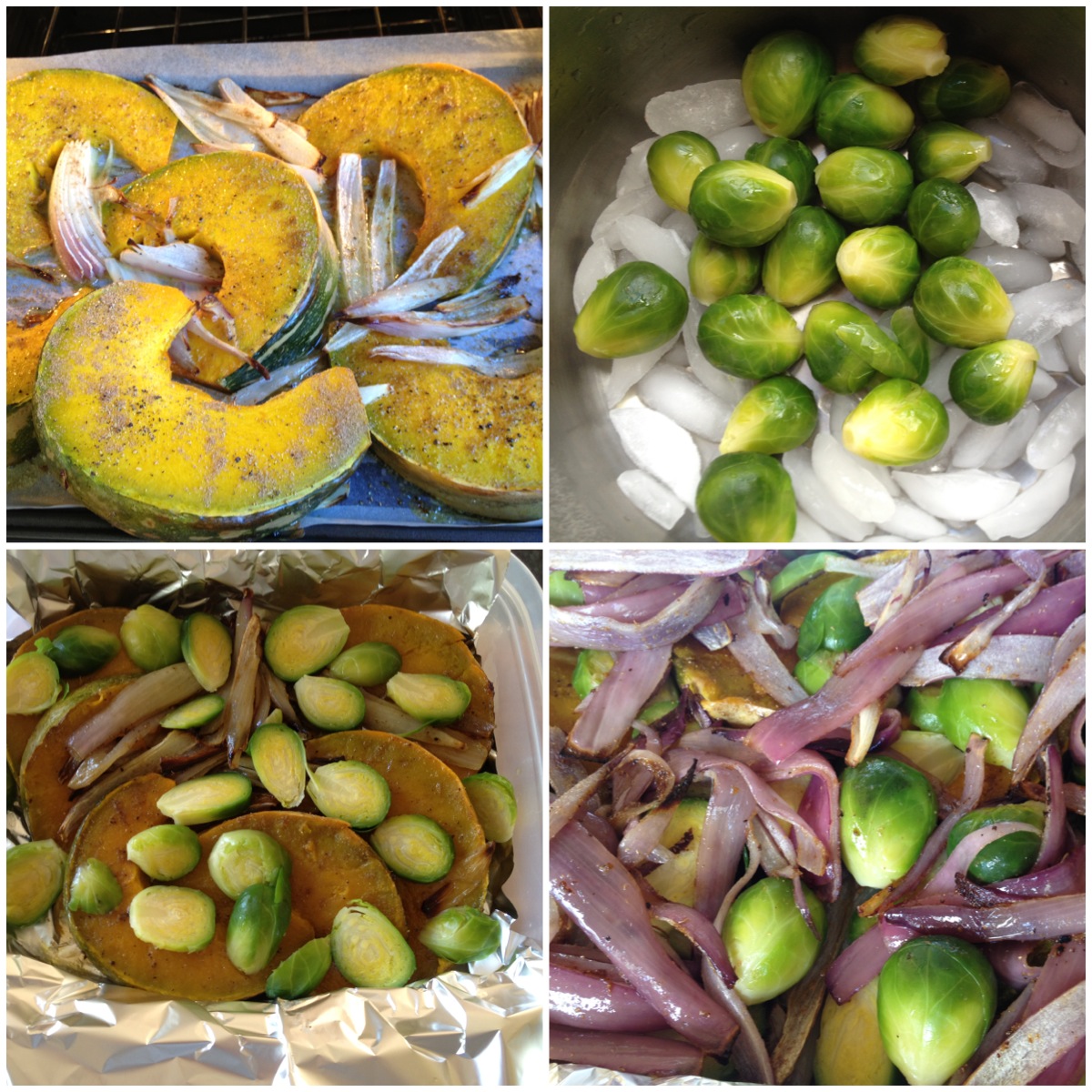 Method Roast (approx. 20 mins in a 180C degree oven) pumpkin and onions with a sprinkle of coriander, cracked pepper and drizzle of olive oil. In the meantime steam or boil brussel sprouts in salty water for 3-5 minutes and to keep them green and fresh, I place them in some ice. Once pumpkin and onions are cooked I lay them with the sliced brussel sprouts to absorb the beautiful sweet flavour and juices.