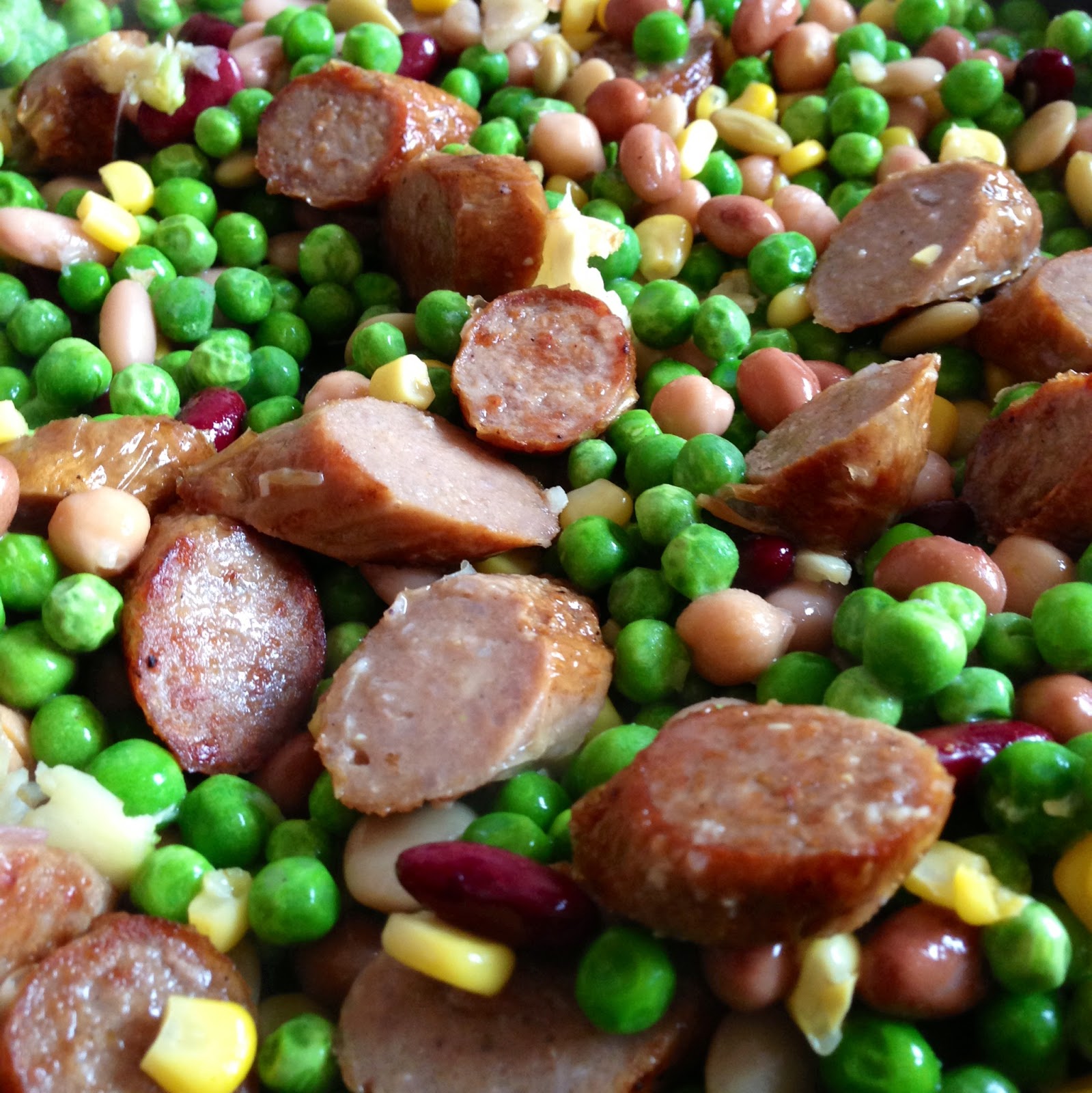 - 4 left over bbq turkey sausages (sliced them up) - 2 cloves of garlic - yellow curry paste - mustard powder - 180 Nutrition coconut protein powder - splash of milk - 1 can of corn - x2 cans of mixed beans/legumes - 1 cup of frozen peas