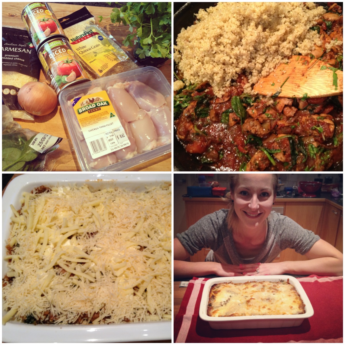 At this point you can serve the quinoa and chicken together as is, however our kids love the cheesy factor so I layered the casserole dish with 1/2 the quinoa/chicken mix, then sprinkled mozzarella, parmesan cheese and repeated again with the remaining quinoa/chicken mix a few tablespoons of ricotta and then the 2 cheeses. Bake for approximately 15 minutes in 200-180C degrees oven or until golden brown.